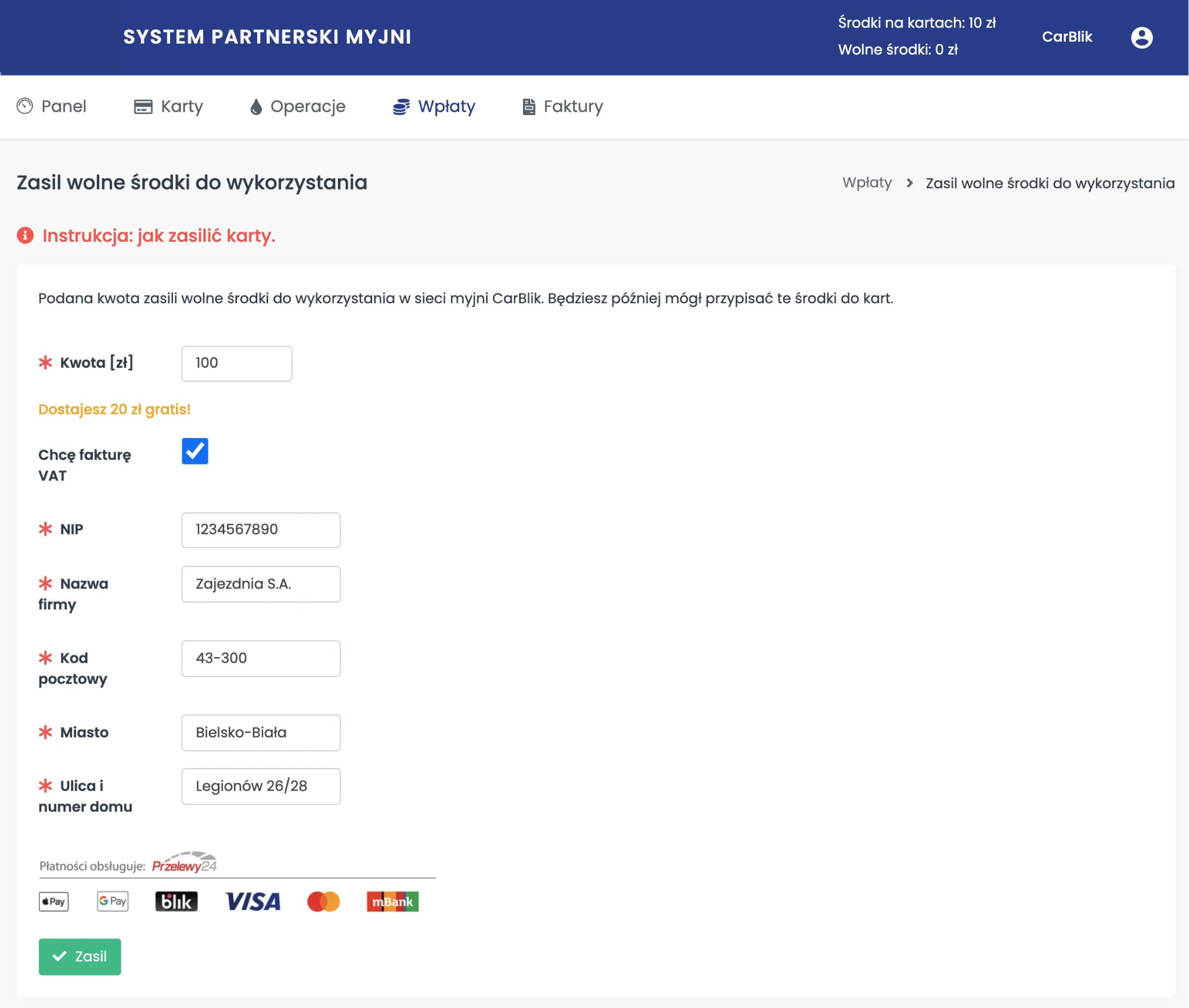 Uzyskanie faktury przy zasileniu konta w systemie partnerskim